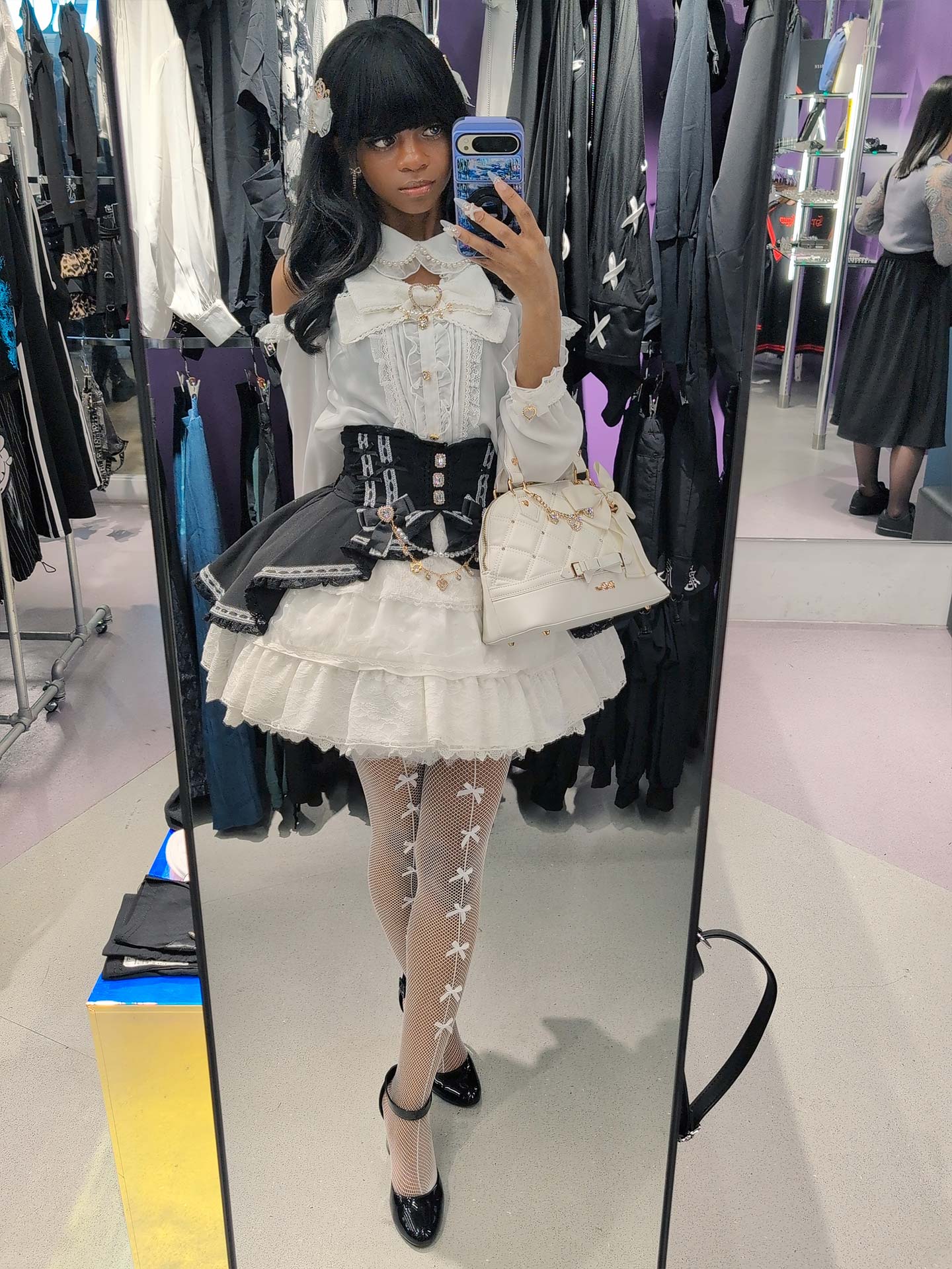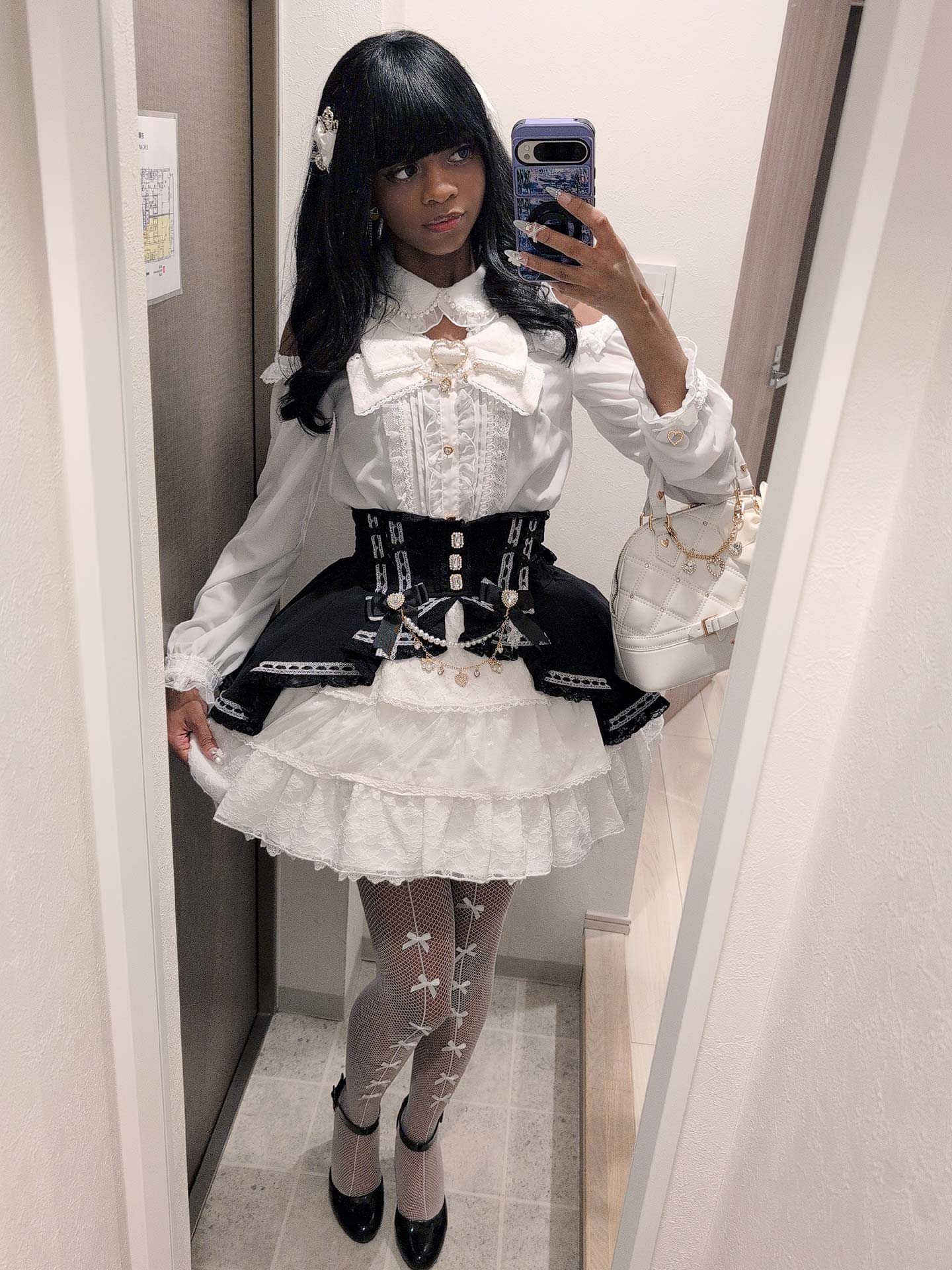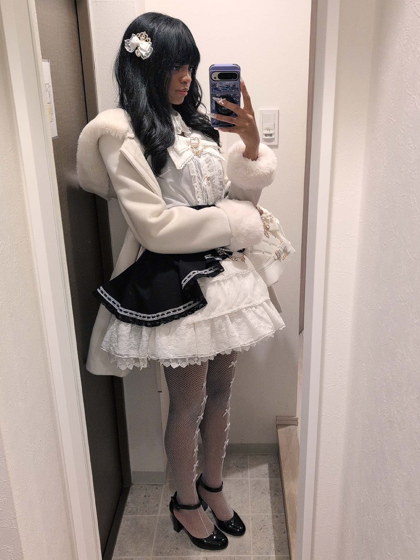 I used not one, put two petticoats to get this poofy, voluminous skirt look. I felt it gave the outfit even more of a “princess” like feel to it. I wore Tiara like hair bows to continue the princess theme. I finished off the look with simple black patent leather heels, bow stockings, press on nails, and a fluffy winter coat from Secret Honey.